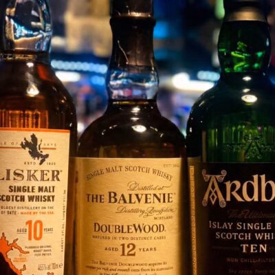 Talisker 10, The Balvenie DoubleWood 12 y Ardbeg 10, en la barra de un bar con ambiente acogedor.
